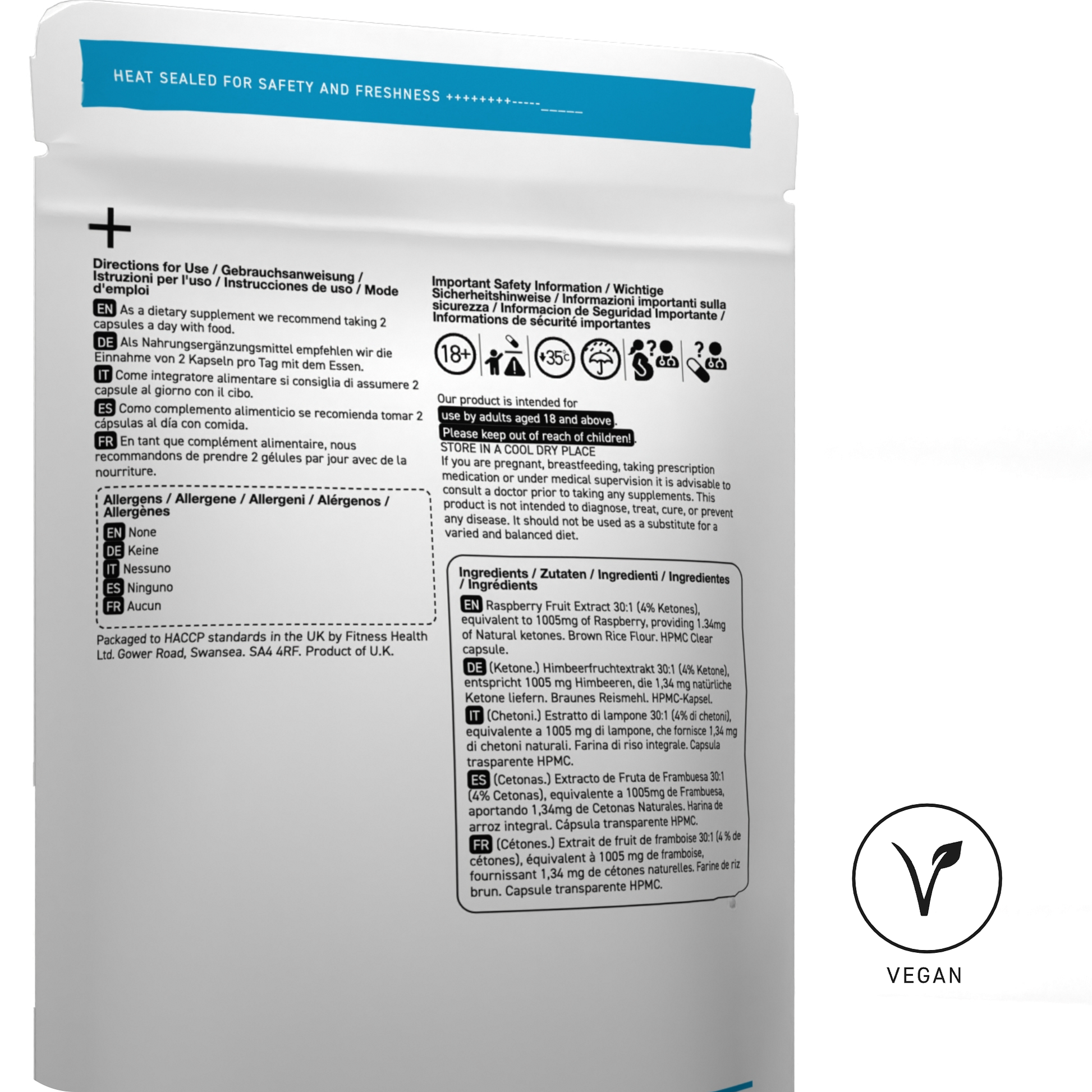 Raspberry Fruit Extract 30:1 (4% Ketones), equivalent to 1005mg of Raspberry, providing 1.34mg of Natural ketones. Brown Rice Flour. HPMC Clear capsule.